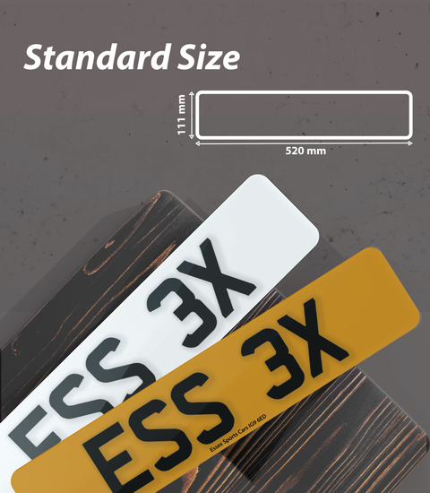 Standard Size is for all UK road cars out there. This plate compliments the Essex Sports Cars Number Plate Frame Trim. All plates will require original documents to be supplied to us, more info can be read here. All we need is your current registration number, e.g. AB10 DEF.